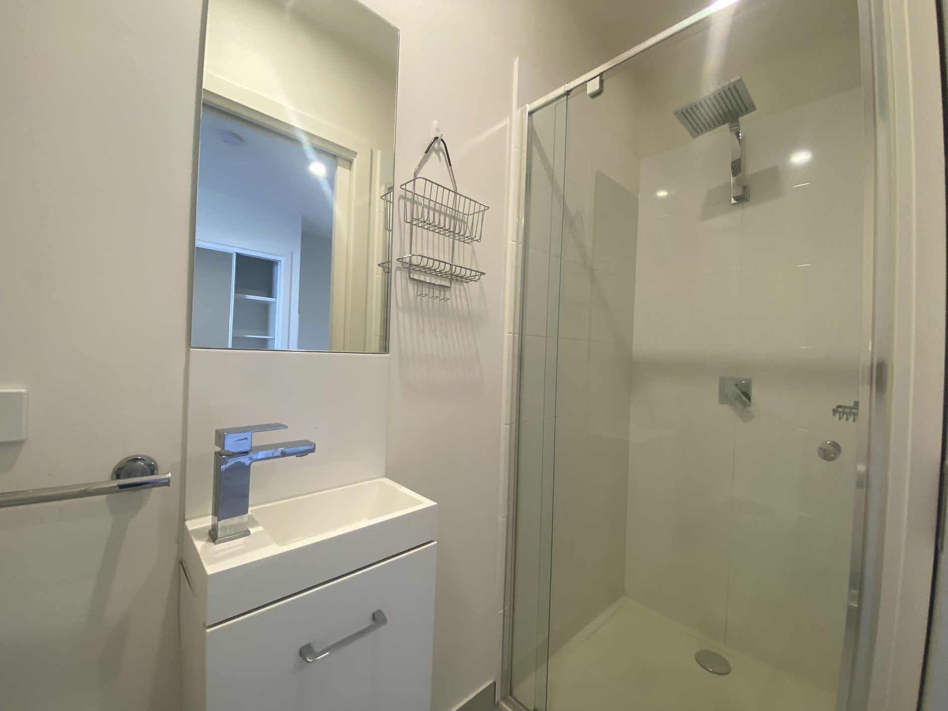 - Bathroom with shower and vanity with cupboard.