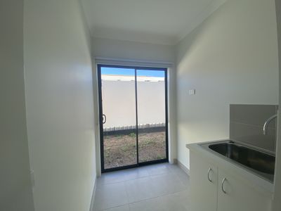 A central bathroom with separate bathtub and shower recess and large laundry with storage facility and enough space for a second fridge or freezer.
