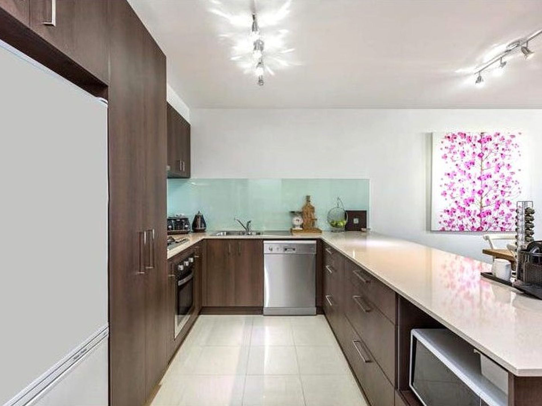 - Modern kitchen with stone benchtops, glass splashback and Blanco stainless appliances (gas cooktop, oven, dishwasher, ducted rangehood).
