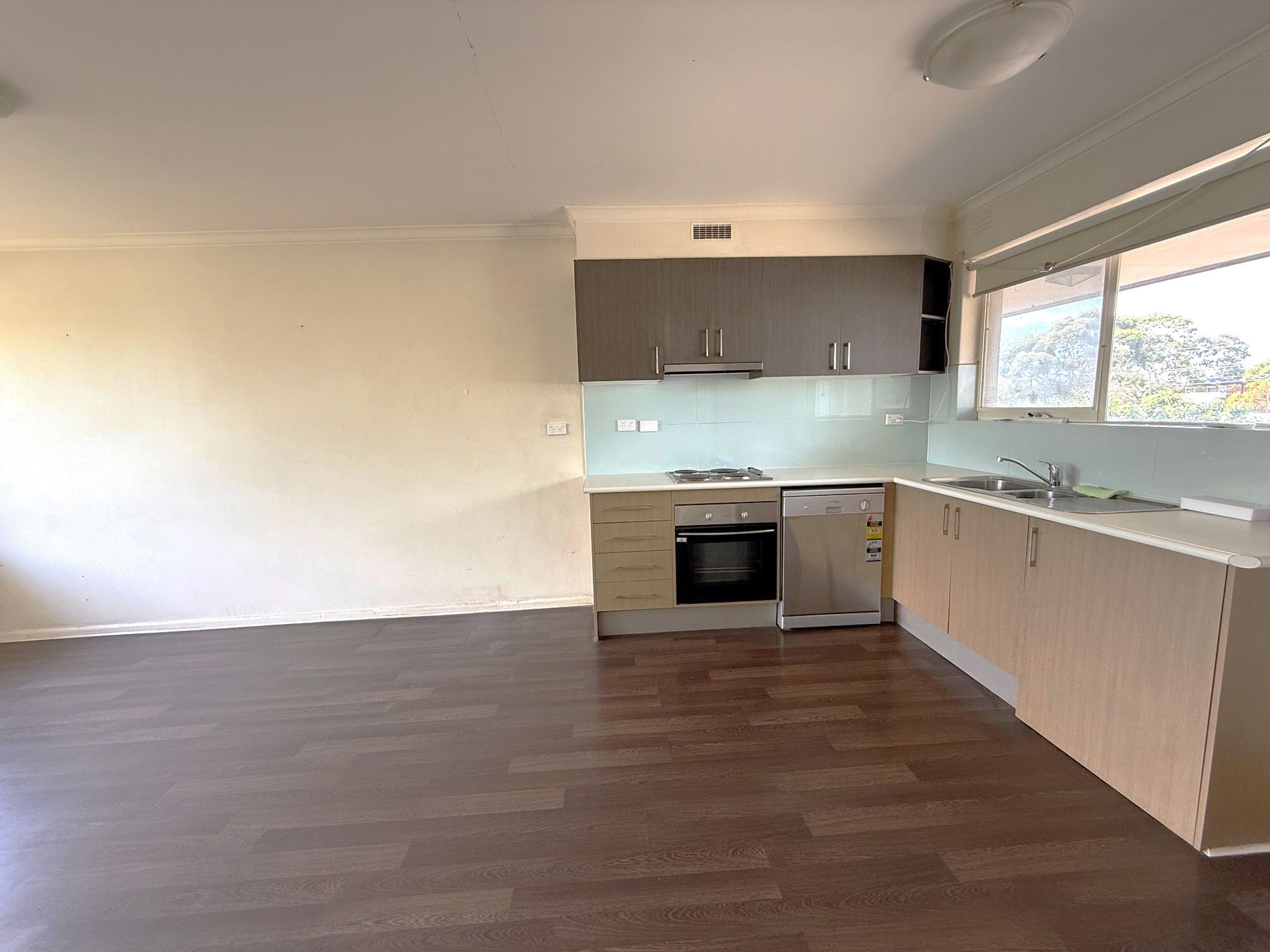- Functional kitchen with timber finishes and stainless steel appliances, including dishwasher