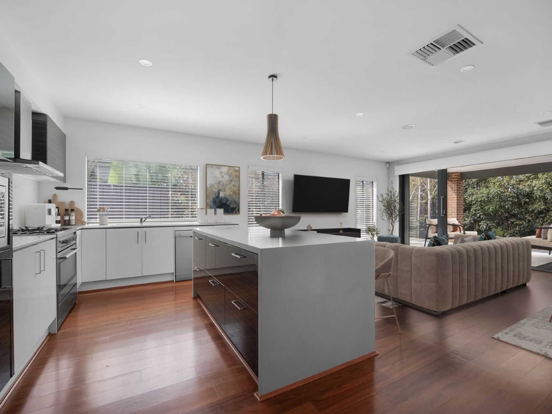 The stylish kitchen is fitted with stone benches, stainless steel appliances including a 900mm gas top oven.