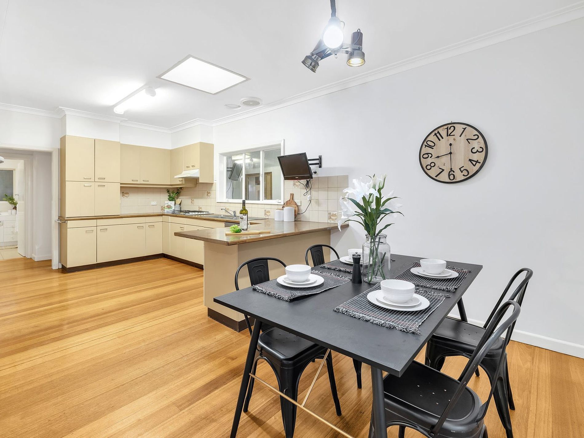 - Functional open-plan kitchen and dining area featuring gas cooking, dishwasher, ample bench and cupboard space.